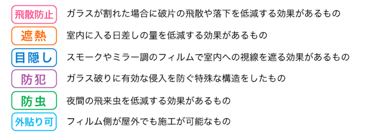 飛散防止効果はもちろん、遮熱・目隠し効果・防犯効果・防虫効果など用途に合わせた効果のフィルムをご用意しています。