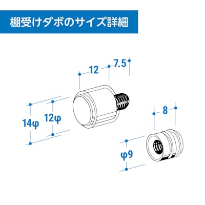 透明ガラスの棚板と、棚受けダボ(金具)のセットです。木製の壁や家具に、ガラス棚を後付けできます。設置方法は、棚受けダボを取り付けて、ガラス棚板を載せるだけとなっています。