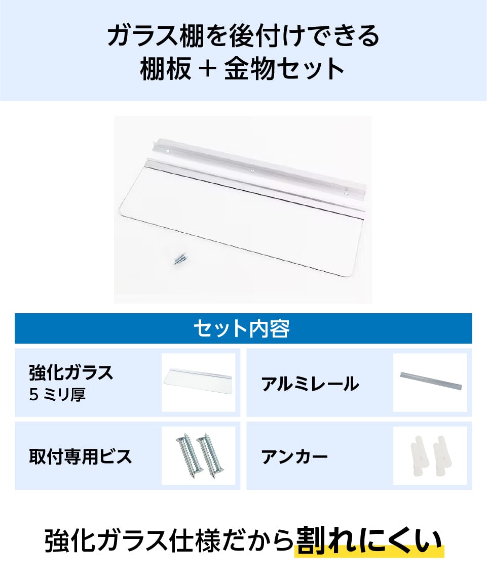 壁付けのガラス棚を取り付けられるセットです。洗面所・キッチン・リビングなどの壁に、清潔感のあるガラス棚を後付けできます。
