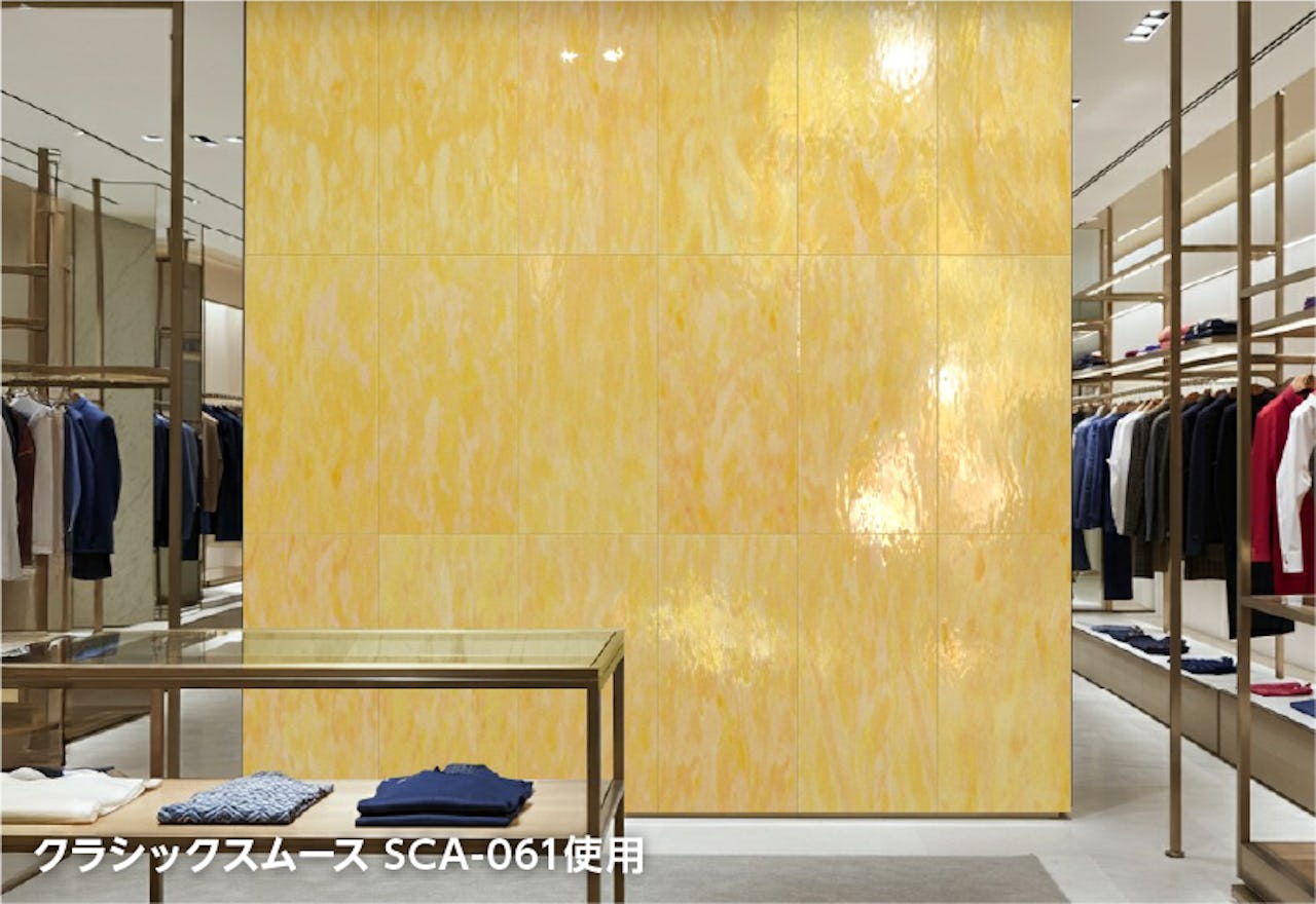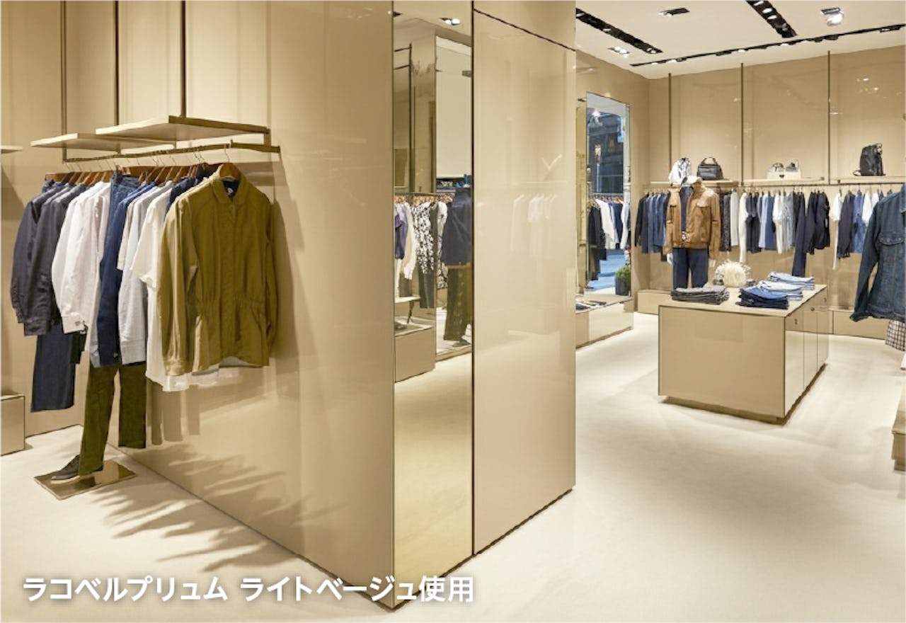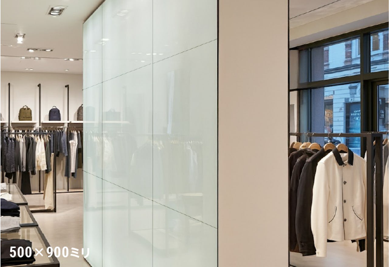 「ホワイトガラス」は、ガラス特有の青みを極限まで抑えた「高透過ガラス」を白く塗装したガラスです。純粋な白色をしているので、清潔感のあることからアパレルショップの壁面やテーブル天板などに使われています。