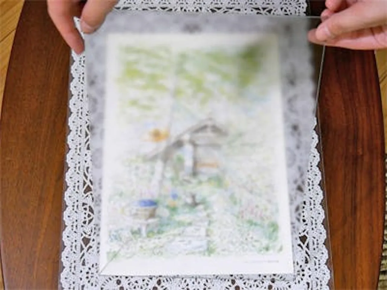 写真のように被写体に密着させた場合は通常のガラスのように透明に見えますが、被写体から離すとすりガラスのようにくもって見えるガラスで、本やカタログなどを撮影するなど、被写体にガラスを密着させて撮影する場合にオススメのガラスです。