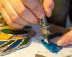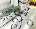 当社のステンドグラスは、複数のガラス片を組み合わせて作る従来の作り方ではなく、1枚のガラスの上に機械で模様を描き、着色をして作ります。