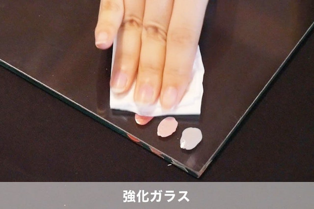 今回テーブルトップとして使用するのは、ネイルテーブルとしてもよく使用されている「化粧板」、割れることがなく安全な「アクリル」、強度や高級感のある「強化ガラス」の3種類です。この3種類の天板を使用して、通常の除光液で拭き取った場合、ジェルネイル用の除光液で拭き取った場合の天板の状態を比較していきます。