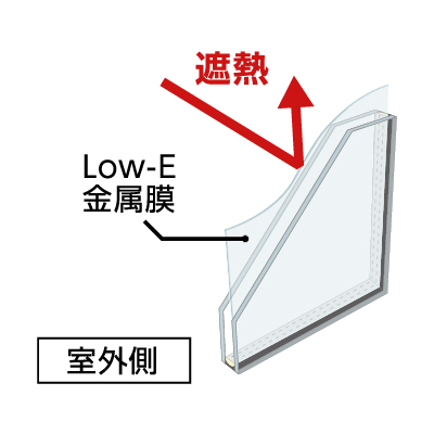 金属膜のコーティングの仕方によって、遮熱効果と断熱効果が選べます。窓から入る強い西日にお困りの方は、室外側に金属膜をコーティングしたLow-Eペアガラスがおすすめです。