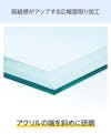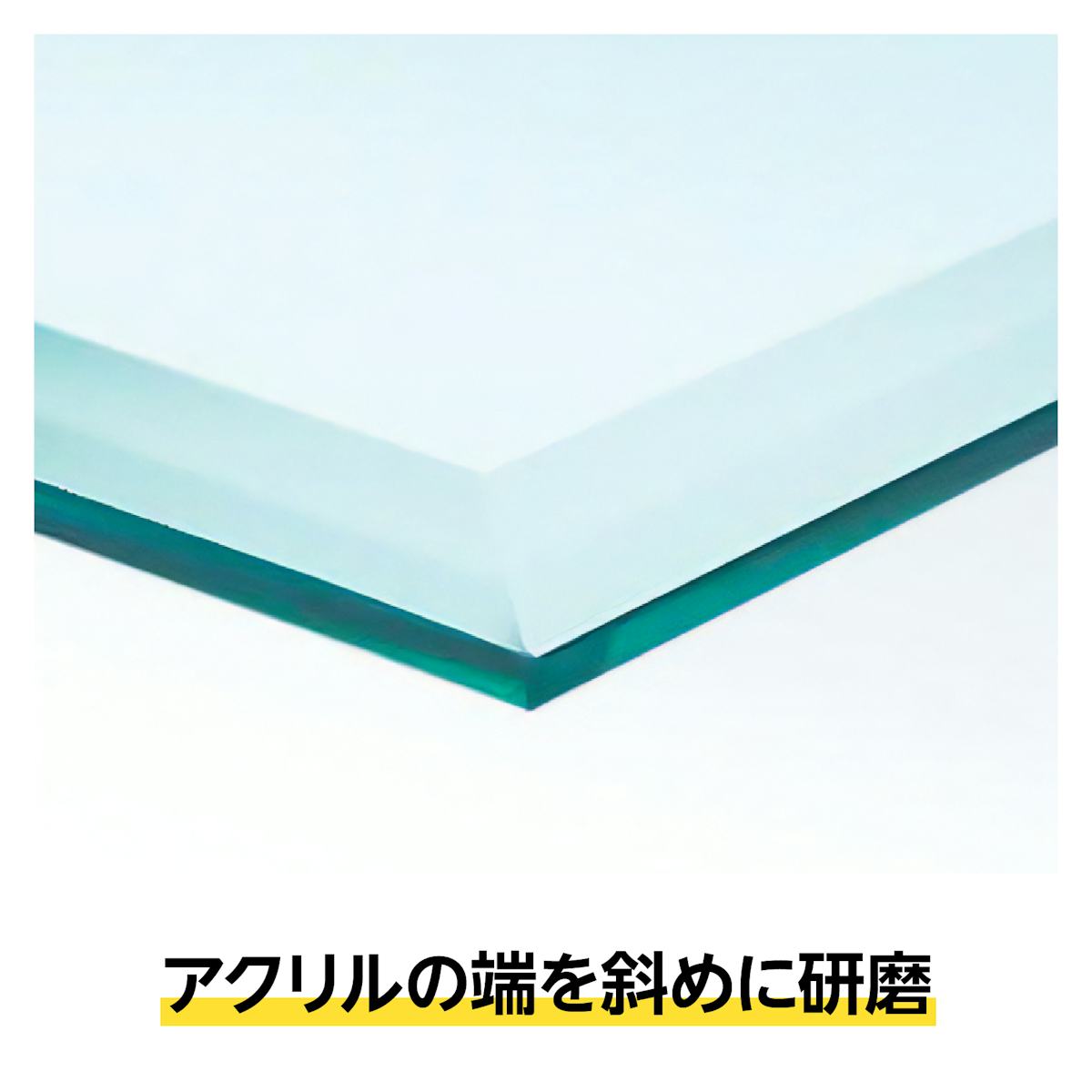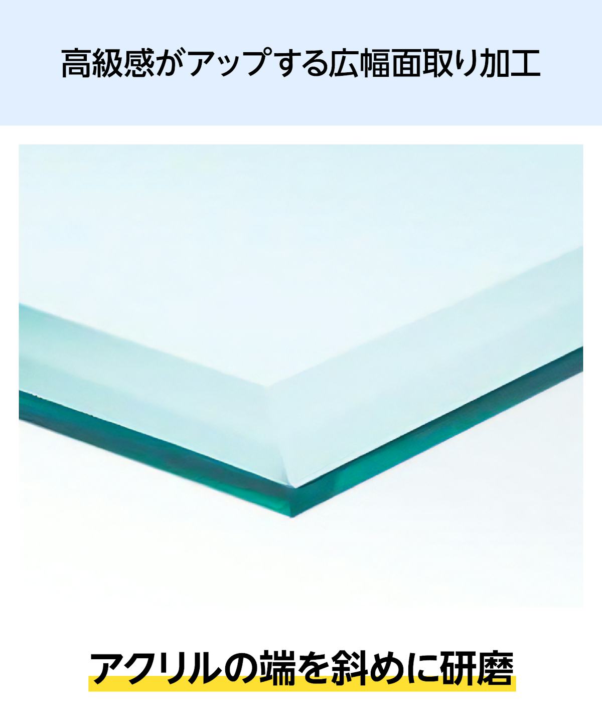 アクリルの端を斜めに研磨する「広幅面取り加工」もご指定いただけます。研磨する幅の指定が可能で、美しく見えるベストの角度で加工します。