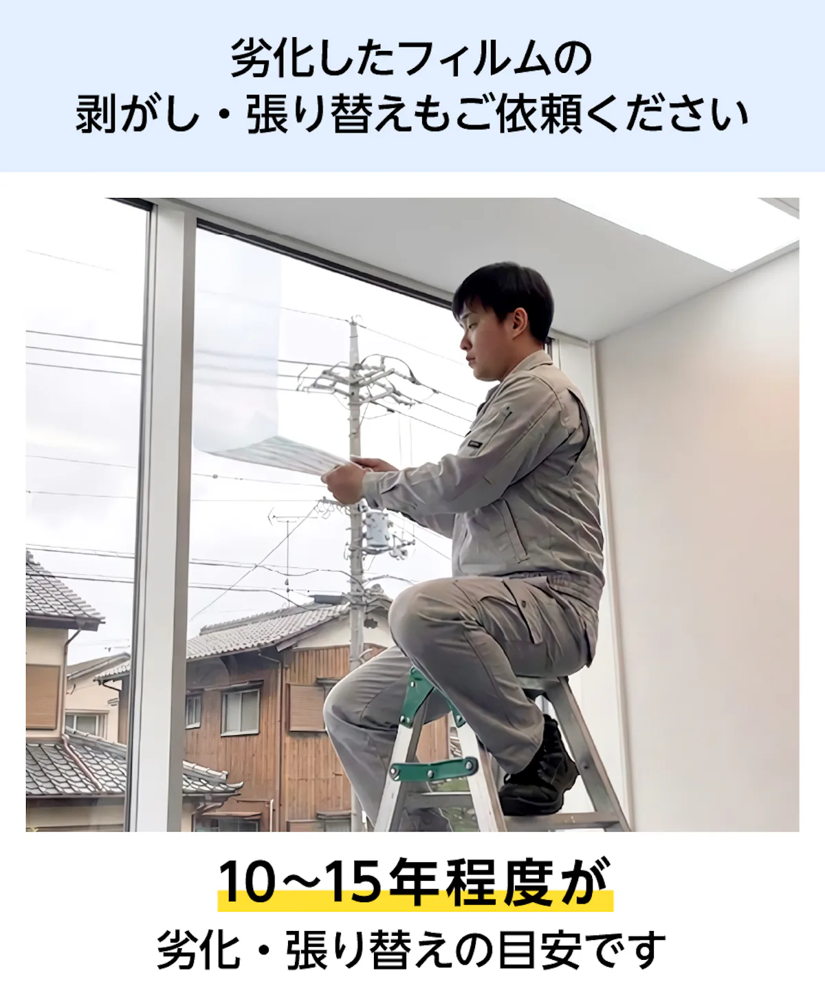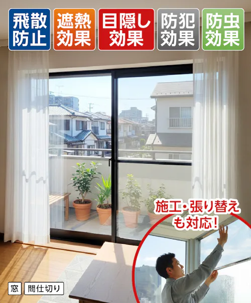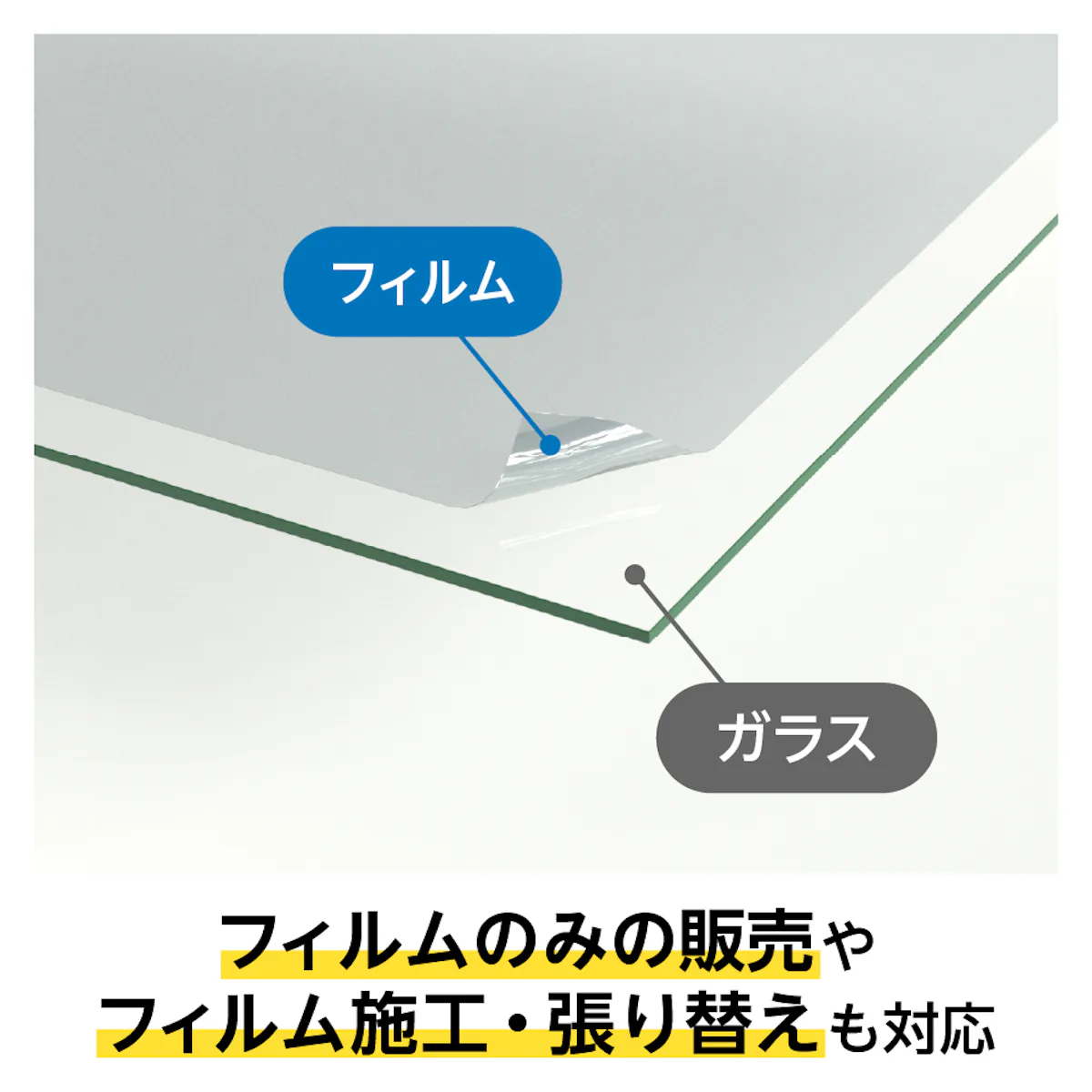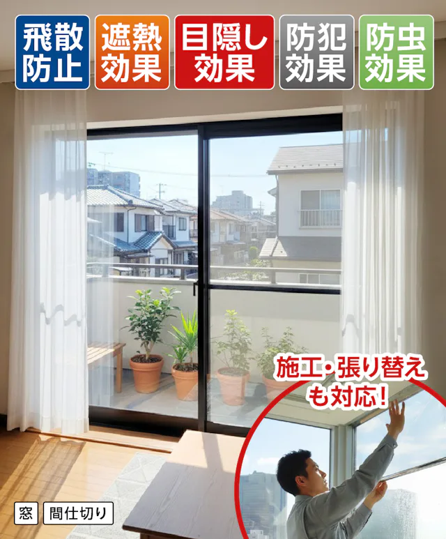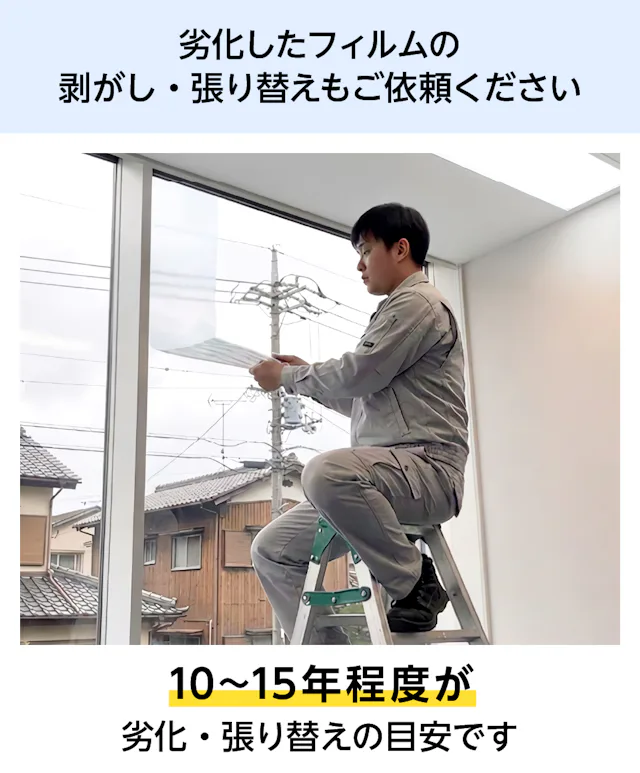 フィルムのみの販売、既存ガラスへの施工や、劣化したフィルムの張り替えにも対応していますので、お電話・お見積フォームからお気軽にご相談ください。