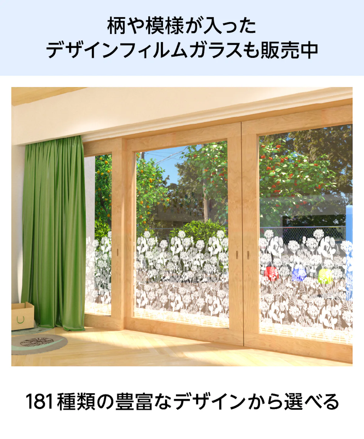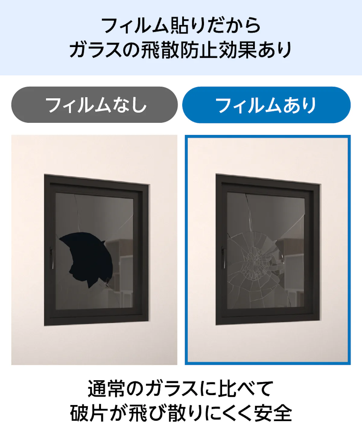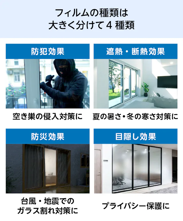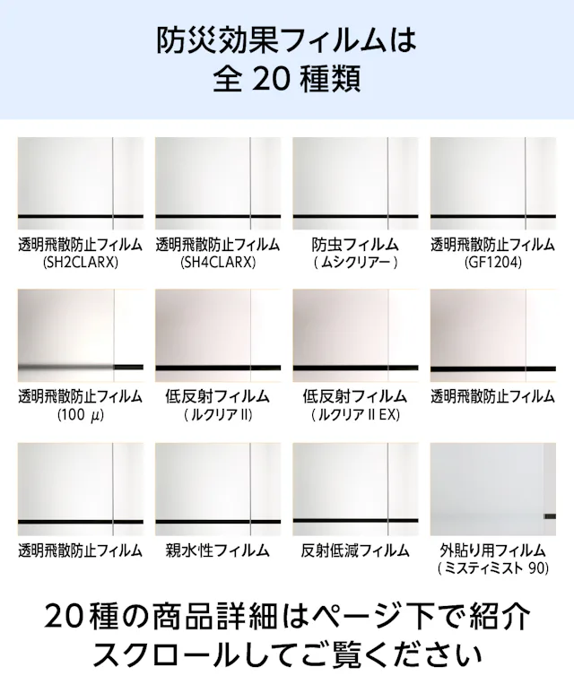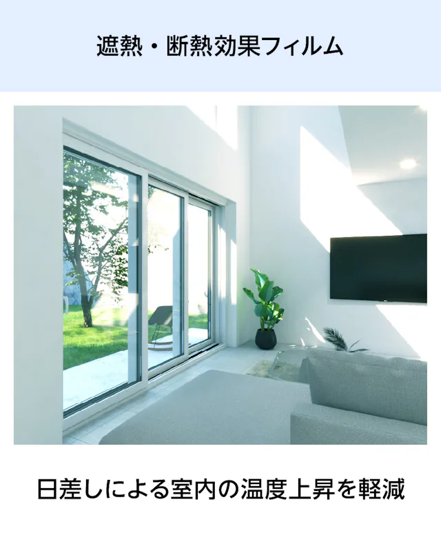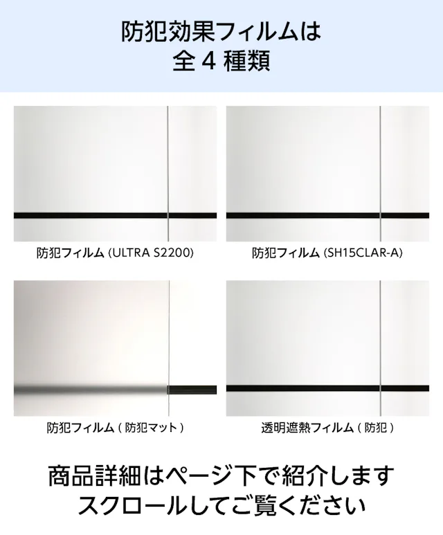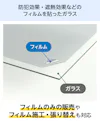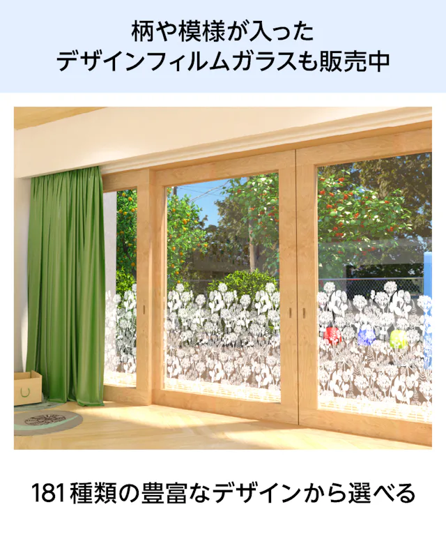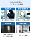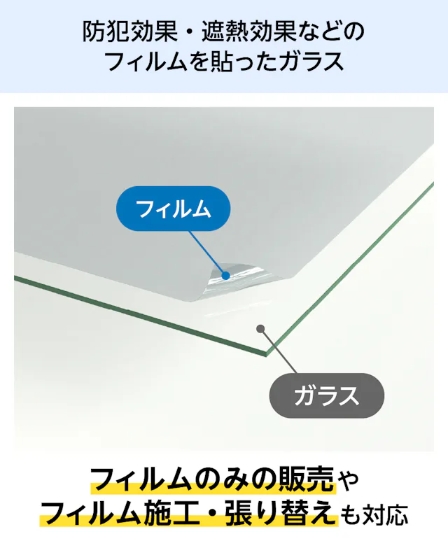 フィルムガラスは、防犯・遮熱・防災など、高い機能性を備えたフィルムをガラスに貼り合わせた商品です。用途や使用場所に合わせた機能のフィルムをお選びいただけます。