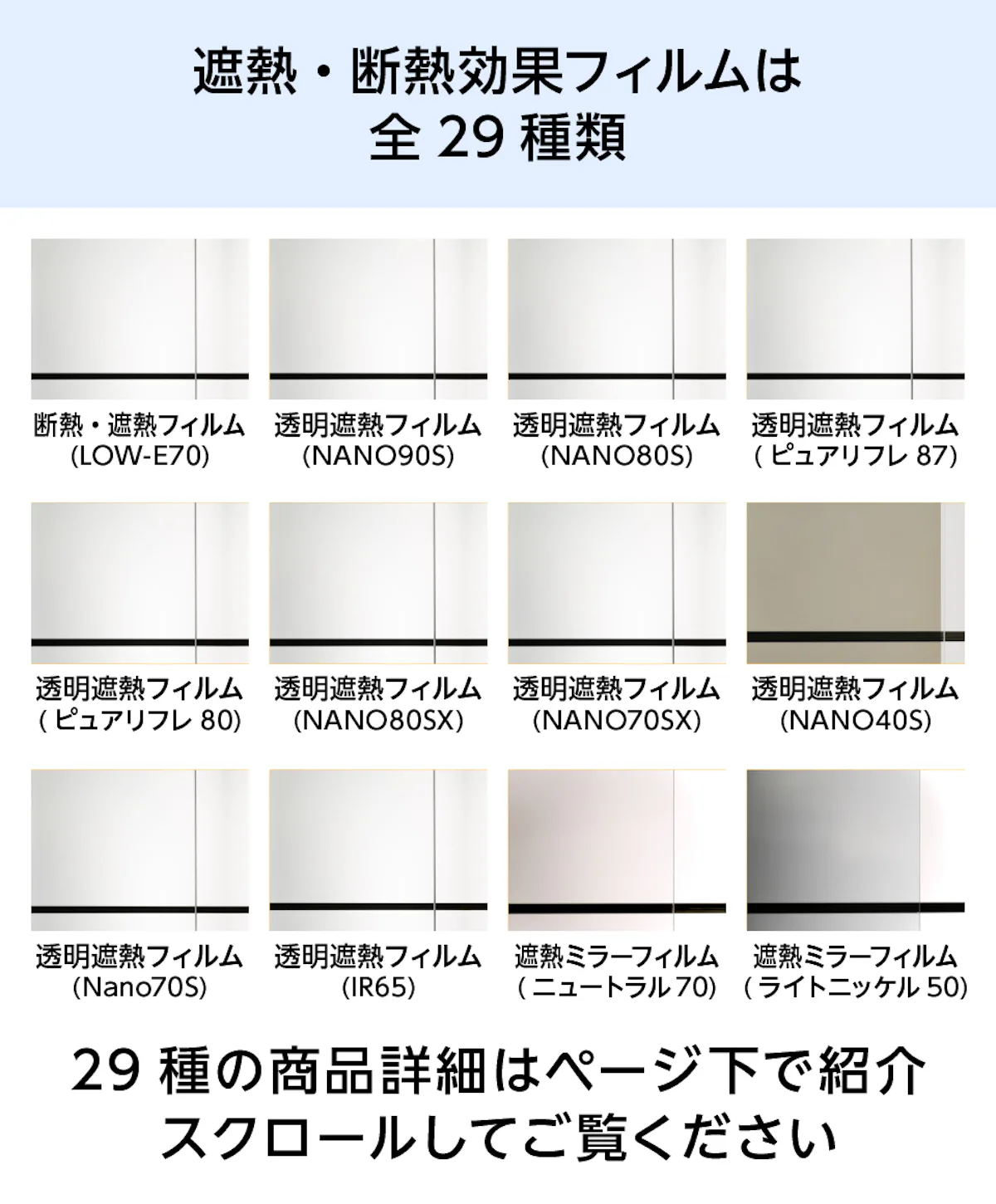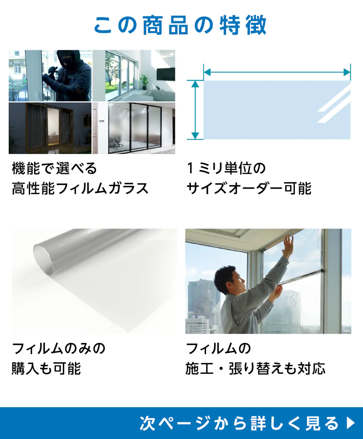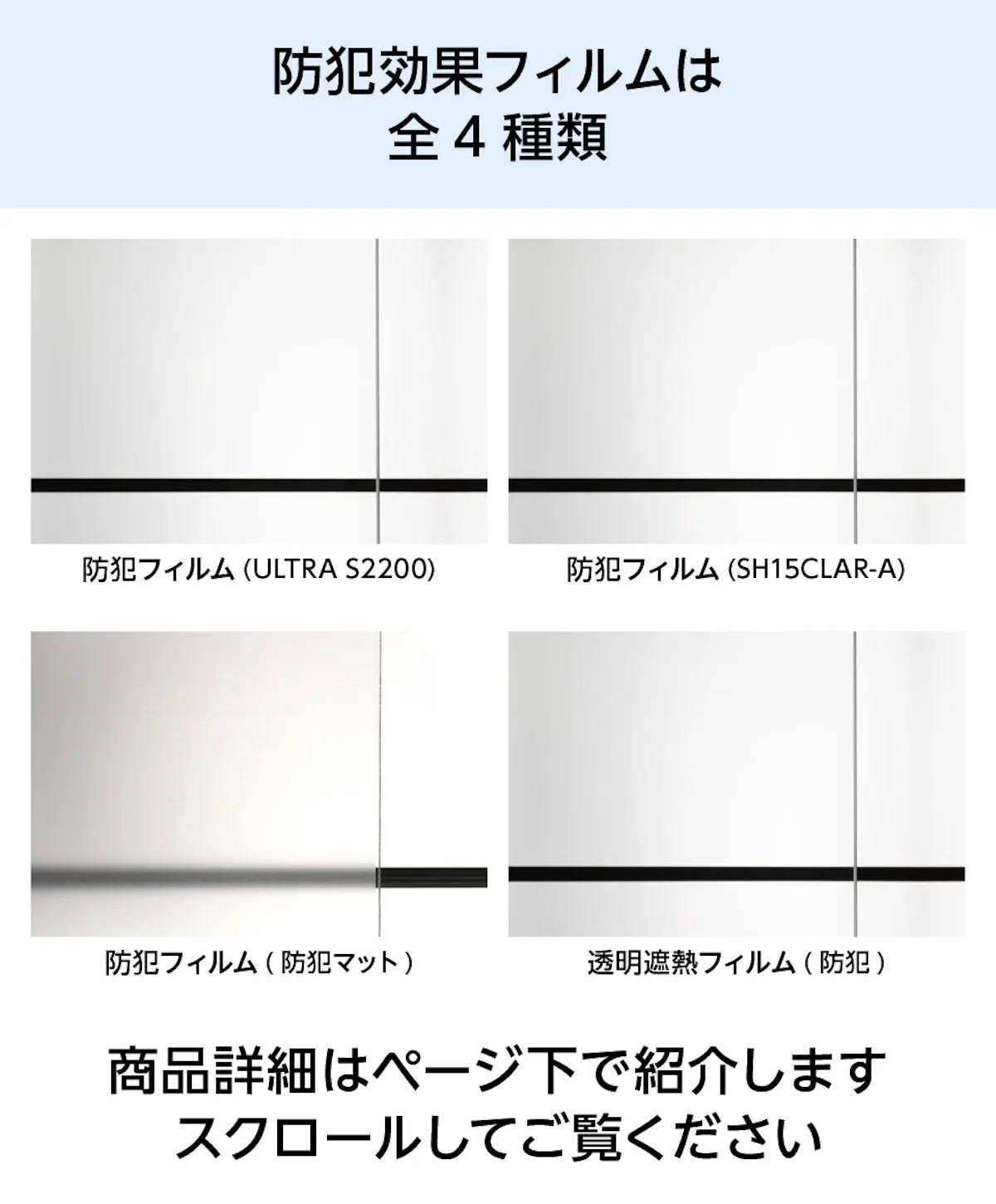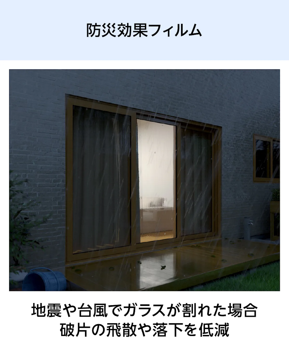 フィルムガラスは、防犯・遮熱・防災など、高い機能性を備えたフィルムをガラスに貼り合わせた商品です。用途や使用場所に合わせた機能のフィルムをお選びいただけます。