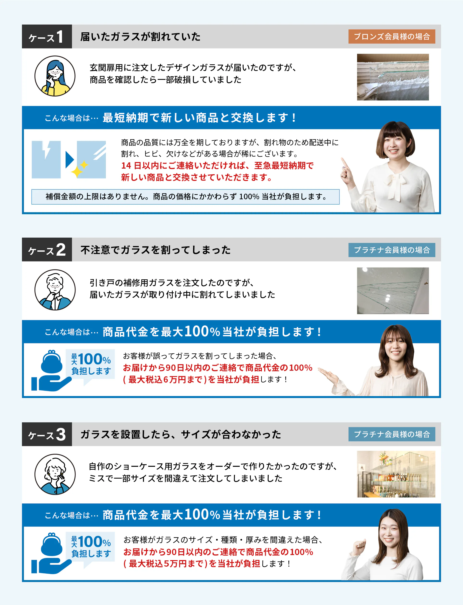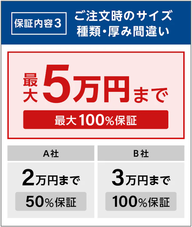 最大100%保証!サイズ間違いや破損の不安を解消する「3つの保証」