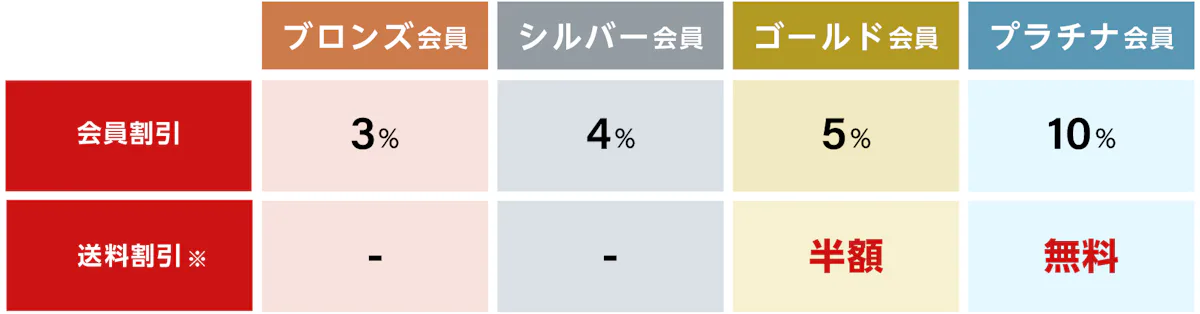 当社では、商品をお得にご購入いただける各種割引をご用意しています。会員ランクが上がれば上がるほどお得にお買い物いただけます。
